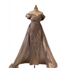 Dieses glamouröse Abendkleid in edlem Taupe ist ein echter Blickfang. Es besticht durch einen stilvollen Carmen-Ausschnitt und einen kunstvoll paillettenbesetzten Rock, der unter einem fließenden, schimmernden Überrock verborgen liegt. Ein perfektes Kleid für unvergessliche Abende.