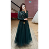 Elegantes Tüllkleid mit Rundhalsausschnitt. Das Oberteil ist mit funkelndem Glitzer verziert und in stilvollen dunkelgrünen und silbernen Streifen gestaltet. Leicht und edel fallend, perfekt für Anlässe wie Abiball, Verlobung oder als Hochzeitsgast. Auch für Hijabi wunderbar geeignet.