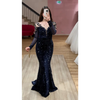 Dunkelblaues, bodenlanges Abendkleid in edler Meerjungfrauenform aus Samt. Mit funkelnden Pailletten verziert – elegant und figurbetont für festliche Anlässe.
