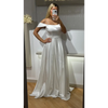 Elegantes, bodenlanges A-Linien-Kleid aus glänzendem Satin. Mit modernem Off-Shoulder-Ausschnitt und einem funkelnden, seitlichen Strass-Träger. Die perfekte Wahl für glamouröse Abende und besondere Anlässe